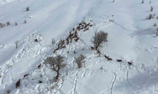 Adıyaman'da kar üzerinde kalabalık şekildeki yaban keçileri havadan görüntülendi.