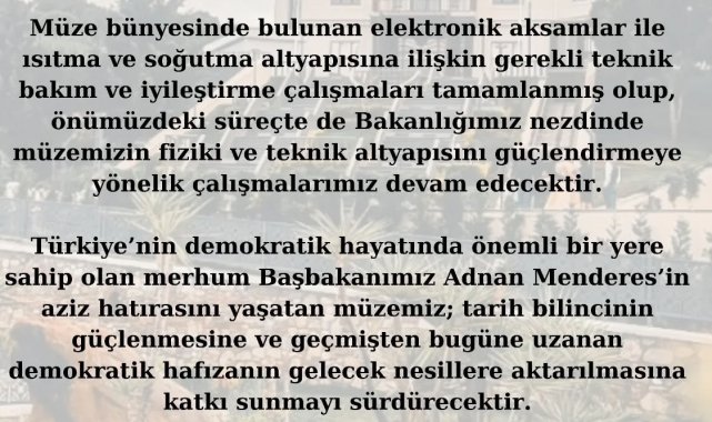 Aydın İl Kültür ve Turizm Müdürlüğü'nden yapılan yazılı açıklamada, müze bünyesinde bulunan elektronik aksamlar ile ısıtma ve soğutma altyapısına yönelik teknik bakım ve iyileştirme çalışmalarının tamamlandığı belirtildi. Yetkililer, gerçekleştirilen çalışmalarla birlikte müzenin daha sağlıklı ve sürdürülebilir bir şekilde hizmet vermesinin hedeflendiğini ifade etti. Açıklamada ayrıca, önümüzdeki süreçte de Kültür ve Turizm Bakanlığı nezdinde müzenin fiziksel ve teknik altyapısını güçlendirmeye yönelik çalışmaların devam edeceği vurgulandı. Türkiye'nin demokratik tarihinde önemli bir yere sahip olan merhum Başbakan Adnan Menderes'in hatırasını yaşatan müzenin, tarih bilincinin güçlendirilmesine katkı sunmaya devam edeceği kaydedildi. Müzenin, geçmişten bugüne uzanan demokratik hafızanın gelecek nesillere aktarılmasında önemli bir rol üstlendiği ifade edildi. Aydın İl Kültür ve Turizm Müdürlüğü, tüm vatandaşları yeniden kapılarını açacak olan müzeyi ziyaret etmeye davet etti.