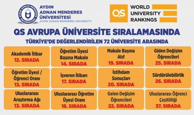 Aydın Adnan Menderes Üniversitesi (ADÜ), uluslararası yükseköğretim derecelendirme kuruluşu QS (Quacquarelli Symonds) tarafından açıklanan 2026 QS Avrupa Üniversite Sıralamasında Avrupa'daki tüm üniversiteler arasında 701-900 bandında yer alırken, Avrupa Batı Asya bölgesinde 79. sıraya yerleşti.