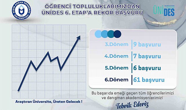 Aydın Adnan Menderes Üniversitesi (ADÜ) öğrenci toplulukları, ÜNİDES 6. Etap proje başvurularında tarihi bir başarıya imza attı. 6. dönem kapsamında toplam 61 proje başvurusu yapılarak önceki dönemlere kıyasla rekor düzeyde katılım sağlandı.