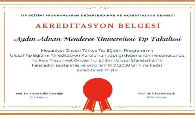 Araştırma üniversitesi olma hedefi doğrultusunda emin adımlarla ilerleyen Aydın Adnan Menderes Üniversitesi (ADÜ), sağlık bilimleri alanındaki kalite odaklı eğitim anlayışı ve topluma hizmet misyonuyla dikkat çekmeye devam ediyor. Bu vizyonun somut yansımalarından biri olarak ADÜ Tıp Fakültesi, tıp eğitimi alanında en prestijli kalite belgelerinden biri olan akreditasyonu alarak ulusal ve uluslararası düzeydeki başarısını tescillemiş oldu.