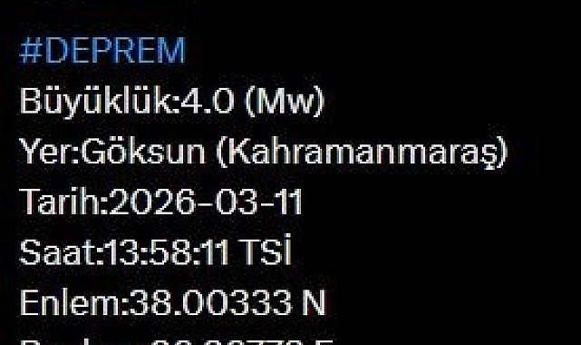 AFAD'ın paylaştığı bilgilere göre, Kahramanmaraş'ın Göksun ilçesinde saat 13.58'de 4.0 büyüklüğünde deprem meydana geldi. Merkezi Göksun olan depremin derinliği 7 kilometre olarak ölçüldü.