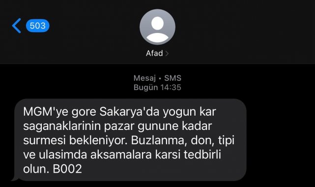 Sakarya'da sabah saatlerinde başlayan ve etkisini artırarak devam etmesi beklenen kar yağışı öncesinde uyarılar art arda geliyor. Meteoroloji ve Valiliğinin ardından bu kez ise AFAD vatandaşları cep telefonlarına gönderdiği SMS ile uyardı. Yapılan uyarıda, "MGM'ye göre Sakarya'da yoğun kar sağanaklarının Pazar gününe kadar sürmesi bekleniyor. Buzlanma, don, tipi ve ulaşımda aksamalara karşı tedbirli olun" ifadeleri yer aldı.
