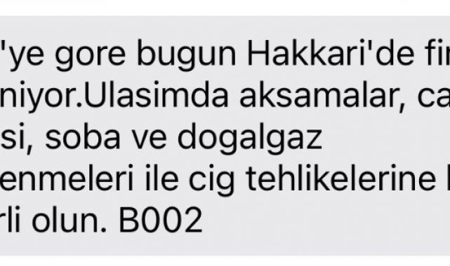 Hakkari ve ilçelerinde etkili olan yağmur ve fırtına hayatı olumsuz yönde etkiliyor. Bu çerçevede Afet ve Acil Durum (AFAD) Müdürlüğü, Hakkari ve ilçelerinde ikamet eden vatandaşlara SMS göndererek tedbirli olunması konusunda uyarıda bulundu. Gönderilen SMS ile bilgilendirme yapan AFAD, "Meteoroloji Genel Müdürlüğü'ne göre bugün Hakkari'de fırtına bekleniyor. Ulaşımda aksamalar, çatı uçması, soba ve doğal gaz zehirlenmeleri ile çığ tehlikelerine karşı tedbirli olun" ifadelerine yer verdi.