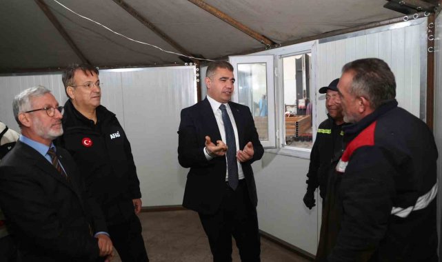Bu çalışmalar kapsamında, afet zamanlarında hızlı kurulum ve güvenli konaklama imkanı sunması hedeflenen bal peteği modelli hibrit konteyner/çadır prototipi üretimini inceleyen Vali Selçuk Aslan, proje hakkında yetkililerden bilgi aldı.