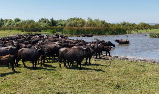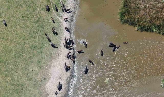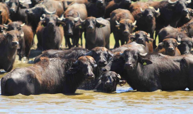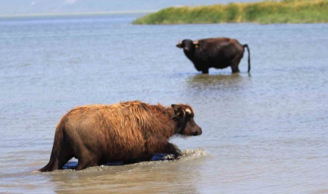 Bursa'nın Mustafakemalpaşa ilçesinin Uluabat Gölü'ne kıyısı bulunan kırsal Karaoğlan Mahallesi'nde mandalar yılın her döneminde suya girerek hem serinliyor, hem parazitlerinden arınıyor, hem de süt verimi artıyor.