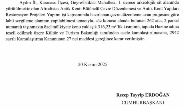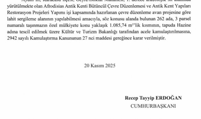 UNESCO Dünya Mirası Listesi'ndeki Afrodisias'ta yıllardır süren kamulaştırma sorunları çözüme kavuşurken, çevre düzenlemesi ve restorasyon projeleri kapsamında gerekli görülen parseller için yayımlanan Cumhurbaşkanı kararı ile acele kamulaştırma süreci başlatıldı.