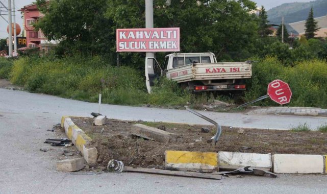 Kazada savrulan kamyonet reklam tabelasına çarparak durabildi