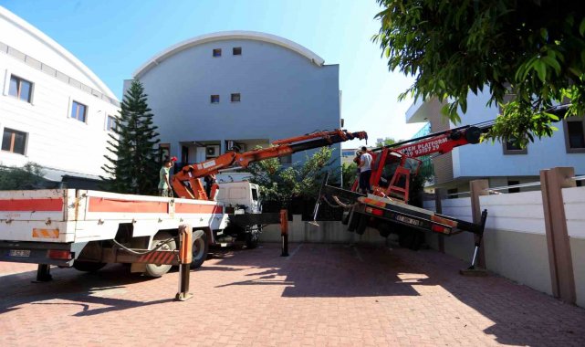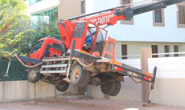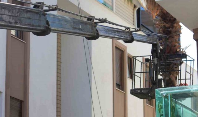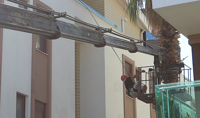 Antalya'da ağaç budaması için kiralanan ve hidroliği boşalan vinç yan yattı. Vincin devrilmesini sitenin duvarı engellerken, olay anında sepette ağaçları budamakta olan görevliyi, bulunduğu yerden itfaiye ekipleri kurtardı.