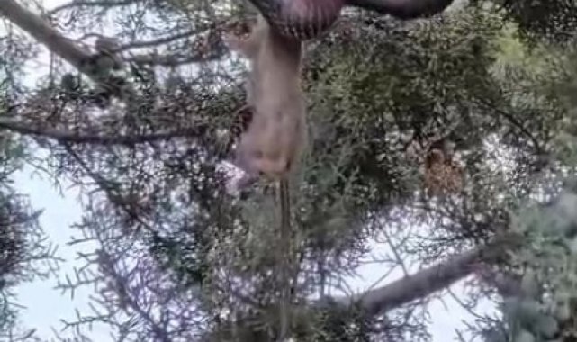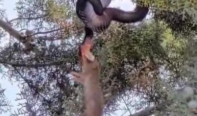 Antalya'da bir vatandaş dinlenmek için oturduğu ağaç gölgesinde karşılaştığı manzara karşısında hayrete düştü. Başının üst kısmından gelen sesle irkilen vatandaş kafasını kaldırdığında ağaç dalına dolanmış ve ağzındaki fareyi yutmaya çalışan yılanla göz göze geldi