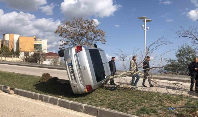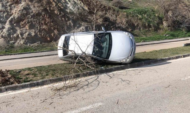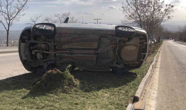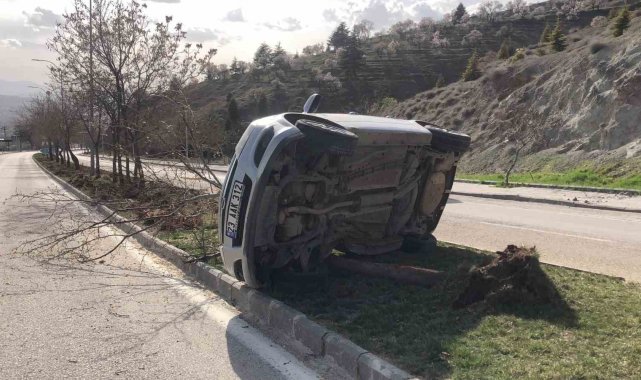 Elazığ'da sürücünün kontrolünü kaybettiği otomobil, refüje çıktı. Ağaca çarparak yan yatan araç takla atmaktan son anda kurtulurken, kazada sürücü hafif yaralandı.