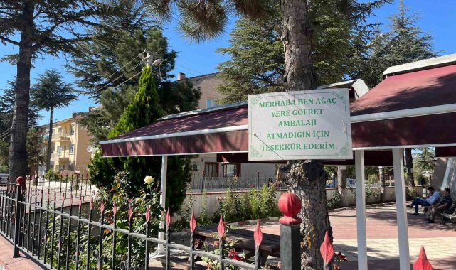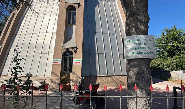 Eskişehir'deki bir cami bahçesindeki ağaçlara asılan yazılı tabelalar, çevre temizliği konusunda farkındalık oluşturuyor.