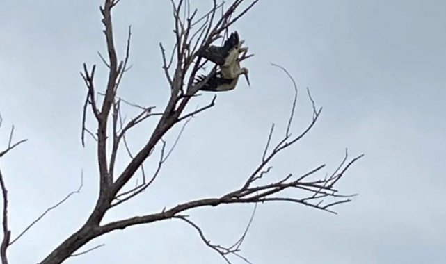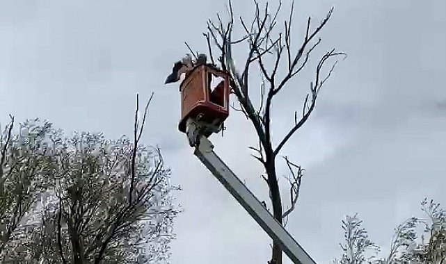 Nevşehir'in Avanos ilçesine bağlı Üçkuyu köyünde ayağı ağaca takılarak mahsur kalan bir leylek, vatandaşların dikkati sayesinde fark edilince adeta seferberlik başlatıldı.