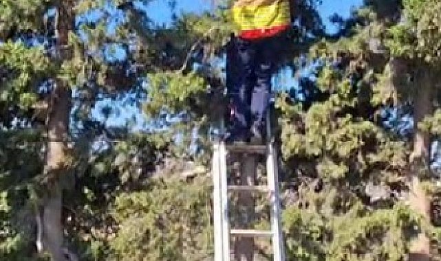 Ağaçta mahsur kalan kedi, merdiven yardımıyla kurtarıldı