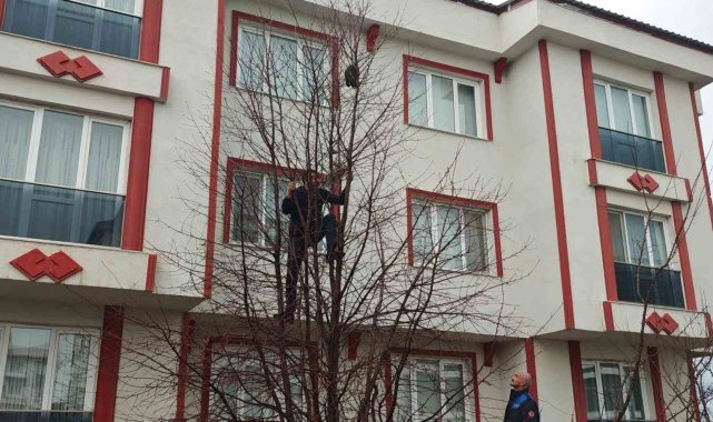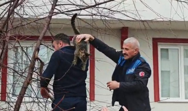 Erzurum'un Aziziye ilçesinde ağaca çıkarak mahsur kalan kedi, zabıta ekiplerinin müdahalesiyle sağ salim kurtarıldı.