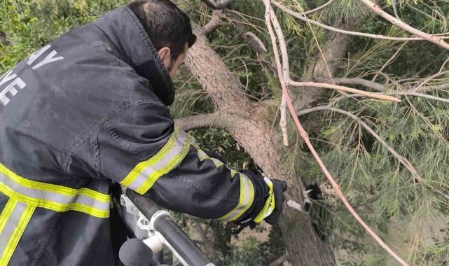Ağaçta mahsur kalan kediyi itfaiye kurtardı