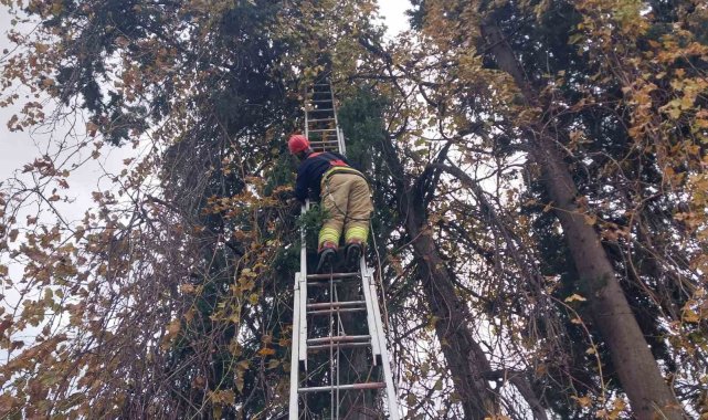Ağaçta mahsur kalan şahini itfaiye kurtardı