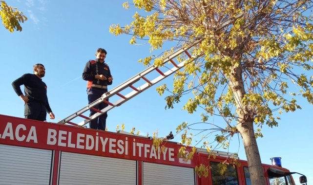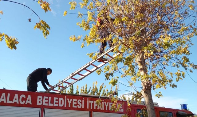 Alaca ilçesi Necmettin Erbakan Parkı'nda tırmandığı ağacın dalında mahsur kalan yavru kediyi fark eden vatandaşlar, durumu 112 Acil Çağrı Merkezi'ne bildirdi. İhbar üzerine bölgeye gelen Alaca Belediyesi itfaiye ekipleri, merdiven yardımıyla kediyi bulunduğu yerden indirdi. Kurtarılan yavru kedi, sağlık durumunun iyi olduğu belirlenmesinin ardından doğal yaşam alanına bırakıldı.