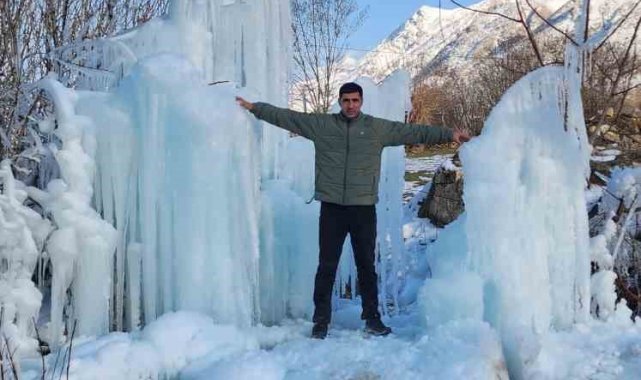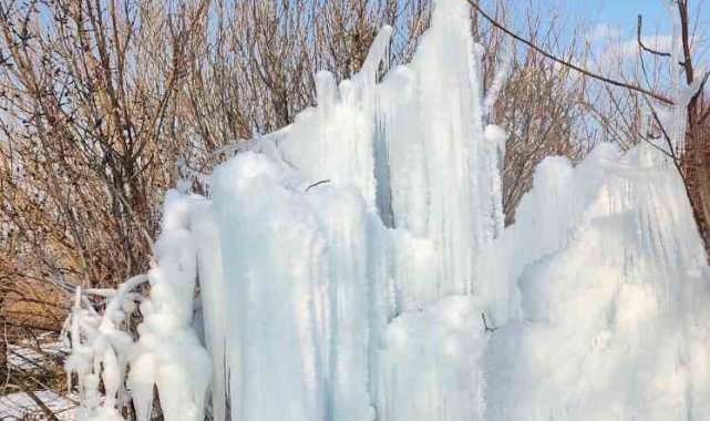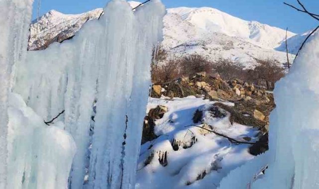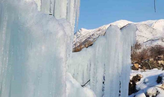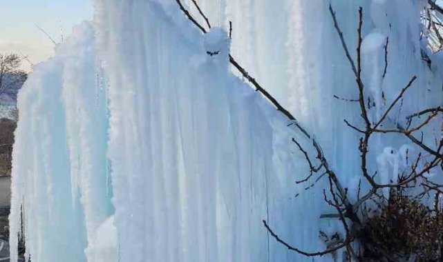 Elazığ'da son günlerde devam eden dondurucu soğuklar, ortaya ilginç görüntüler de çıkartıyor. Özellikle bina çatılarında oluşan ve tehlikeye davetiye çıkartan buz sarkıtları, bu sefer seyrine doyumsuz bir görsel şölen sundu. Elazığ merkeze bağlı İçme bölgesi Değirmenönü köyünde bir ağaçta dondurucu soğuklar nedeni ile buz sarkıtları meydana geldi. Travertenleri andıran sarkıtlar, vatandaşların da ilgi odağı oldu. Bölgeden geçerken görüntü çeken vatandaşlar, ''Burası İçme'ye bağlı Değirmenönü köyü. Aşırı soğuklardan dolayı buz sarkıtları oluşmuş. Yaklaşık 5 metre yüksekliğinde. Çok güzel bir görüntü ortaya çıkmış. Palulu dayının da dediği gibi anlatmaya gerek yok, görüyorsunuz'' dedi.