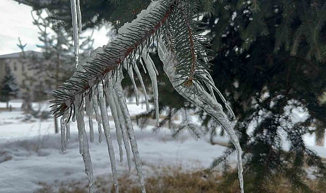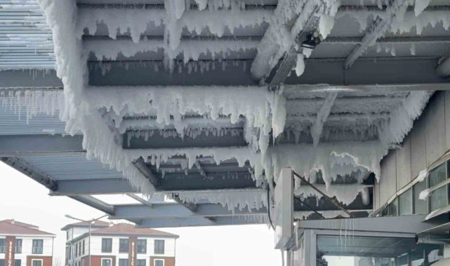 Ağrı'da dondurucu hava nedeniyle kent merkezinde ağaçlar ve bitkiler kırağı tutarken, evlerin çatılarında metrelerce buz sarkıtları oluştu.
