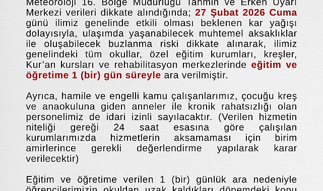 Meteoroloji 16. Bölge Müdürlüğü verileri doğrultusunda, kar yağışı ve buzlanma riski nedeniyle Ağrı genelindeki tüm resmi ve özel okullarda, özel eğitim kurumları, kreşler, Kur'an kursları ve rehabilitasyon merkezlerinde 27 Şubat Cuma günü eğitim ve öğretime 1 gün ara verildi.
