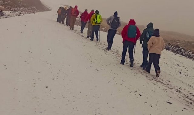 Tırmanış, yerel rehber Cuma Saltık öncülüğünde başladı. Dağcıların karla kaplı zorlu araziye rağmen yürüyüşlerini sürdürdüğü görüldü.