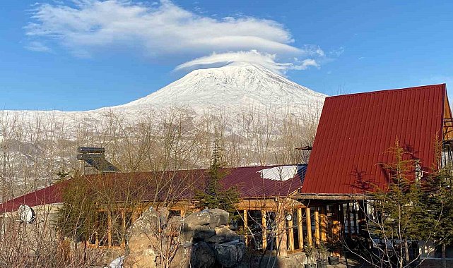 Türkiye'nin en yüksek noktası olan 5 bin 137 metre rakımlı Ağrı Dağı'nın zirvesinde oluşan mercek bulutu, kartpostallık görüntüler oluşturdu. Halk arasında "şapka" olarak adlandırılan bu nadir doğa olayı, karla kaplı zirveyi tamamen sararak izleyenlerde hayranlık uyandırdı.