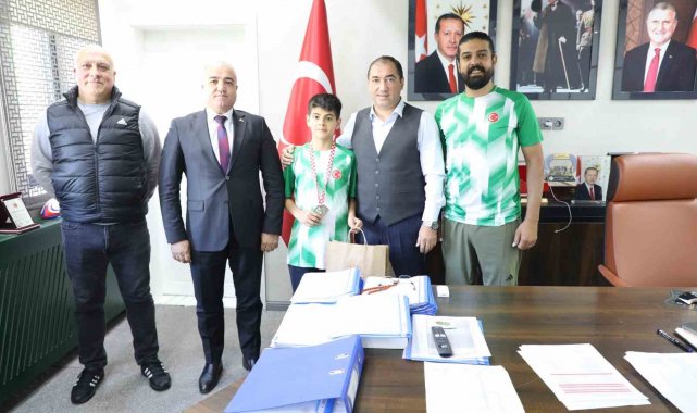 Hırvatistan'da düzenlenen 12. Li-Ning Zagreb Youth Open turnuvasında U-13 kategorisinde altın madalya kazanarak şampiyon olan Ağrılı milli sporcu Eyüp Murat Alpaslan, elde ettiği başarının ardından Gençlik ve Spor İl Müdürü Ahmet Çelebi'yi ziyaret etti.
