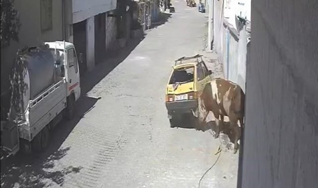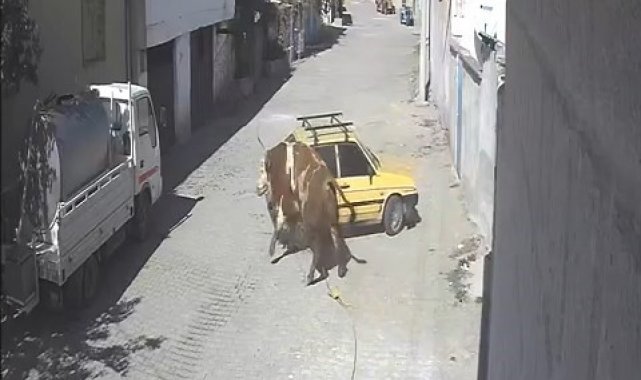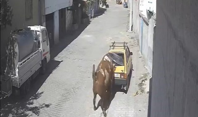 Nevşehir'de ahırdan kaçan bir boğa, ortalığı birbirine kattı. Zincirinden kurtularak kasaba içinde dolaşmaya başlayan kızgın boğa, park halindeki otomobile zarar verdi. O anlar güvenlik kamerasına yansıdı.