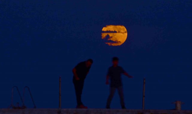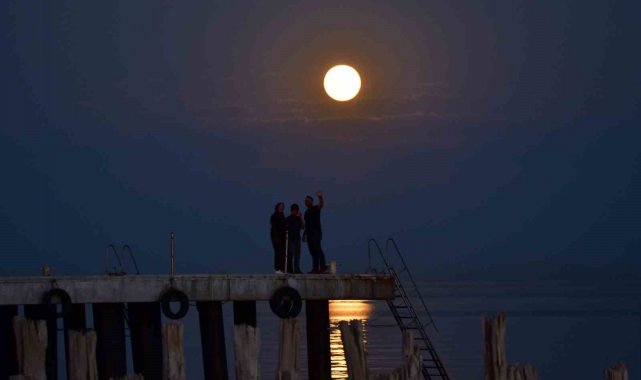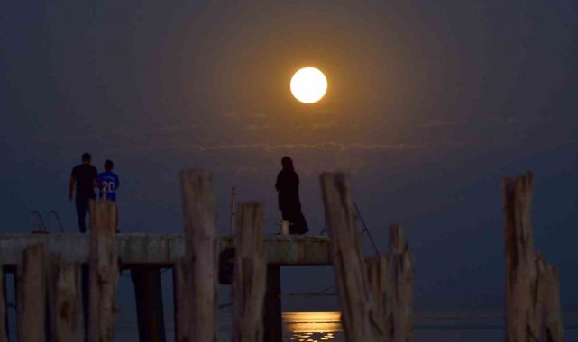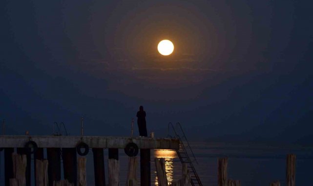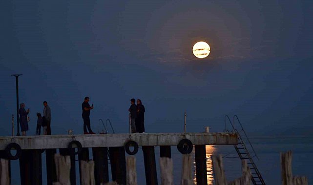 Bitlis'in Ahlat ilçesinde akşam saatlerinde iskele üzerinde beliren dolunay, Van Gölü üzerinde oluşturduğu yakamozla izleyenlere adeta görsel bir şölen yaşattı. Gökyüzünde tüm ihtişamıyla yükselen dolunay, göl yüzeyine yansıyarak eşsiz bir manzara oluşturdu.