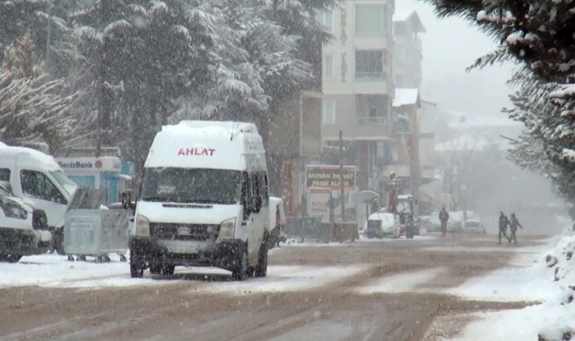 Bitlis'in Ahlat ilçesinde gece saatlerinden itibaren etkisini gösteren kar yağışı ilçeyi beyaza bürürken, kar yağışı nedeniyle ilçeye bağlı 11 köy yolu ulaşıma kapandı.