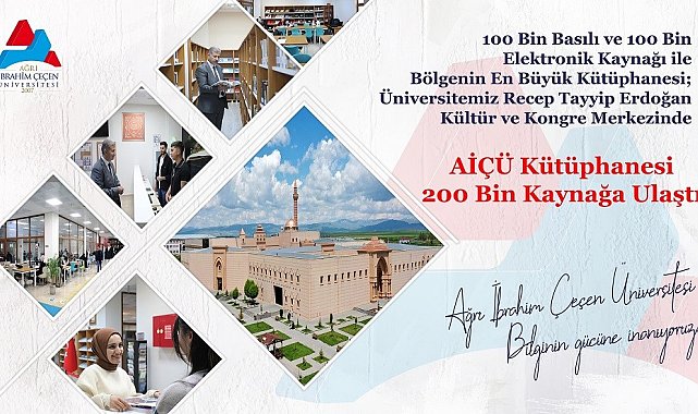 Ağrı İbrahim Çeçen Üniversitesi (AİÇÜ) Recep Tayyip Erdoğan Kültür ve Kongre Merkezi bünyesinde yer alan bölgenin en büyük kütüphanelerinden biri olan AİÇÜ Kütüphanesi önemli bir başarıya imza attı. Üniversite kütüphanesi, 100 bin basılı ve 100 bin elektronik kaynak hedefine ulaşarak öğrenciler, akademisyenler ve araştırmacılar için zengin bir bilgi havuzu oluşturdu.