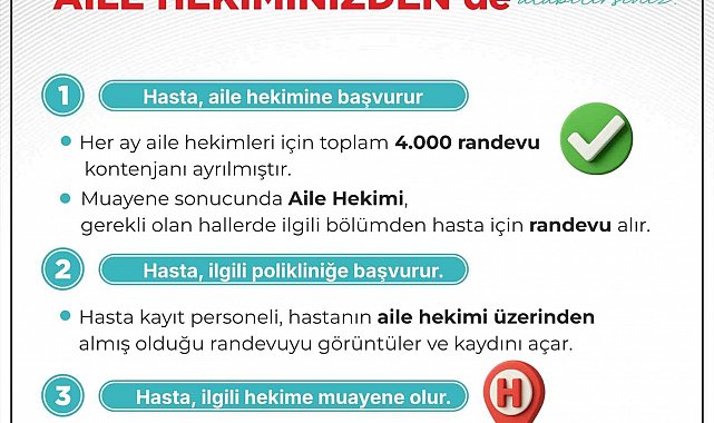 Merkezi Hekim Randevu Sistemi (MHRS) üzerinden randevu bulmakta zorlanan vatandaşlar, artık aile hekimleri aracılığıyla hastane polikliniklerine yönlendirilerek randevu alabilecek. Yapılan açıklamada; "Uygulanan bu sistemle vatandaşlar ilk olarak bağlı oldukları aile hekimine başvurarak muayene oluyor. Muayene sonrasında gerekli görülmesi hâlinde, aile hekimi doğrudan ilgili hastane polikliniğinden hasta adına randevu oluşturuyor. Bu uygulama sayesinde hem hastanelerdeki yoğunluğun azaltılması hem de vatandaşların daha sistemli bir şekilde sağlık hizmetine erişimi hedefleniyor" ifadelerine yer verildi.