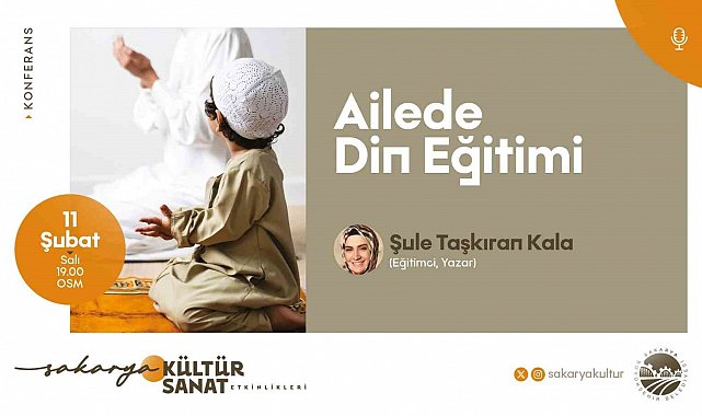 Sakarya Büyükşehir Belediyesi Şubat Kültür Takvimi çerçevesinde eğitimci yazar Şule Taşkıran Kal, 11 Şubat Salı günü OSM'de ailede din eğitiminin kodlarını ebeveynlerle paylaşacak.