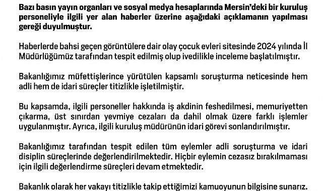 Aile ve Sosyal Hizmetler Bakanlığı, Mersin'de çocuk evleri sitesinde bir çocuğa şiddet uygulandığı haberlerine ilişkin, 2024 yılındaki olayda ilgili personel hakkında iş akdinin feshedilmesi, memuriyetten çıkarma, üst sınırdan yevmiye cezaları da dahil olmak üzere gerekli işlemlerin yapıldığını ve kuruluş müdürünün görevine son verildiğini açıkladı.