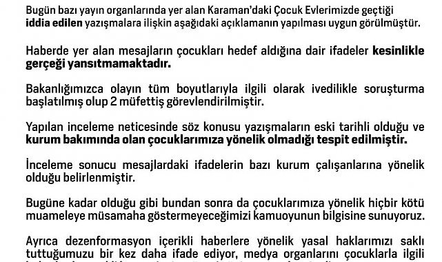 Aile ve Sosyal Hizmetler Bakanlığı, bazı basın yayın organlarında yer alan ve Karaman'daki çocuk evlerinde geçtiği iddia edilen yazışmalara ilişkin açıklama yaptı. Yapılan açıklamada, "Haberde yer alan mesajların çocukları hedef aldığına dair ifadeler kesinlikle gerçeği yansıtmamaktadır. Bakanlığımızca olayın tüm boyutlarıyla ilgili olarak ivedilikle soruşturma başlatılmış olup, 2 müfettiş görevlendirilmiştir. Yapılan inceleme neticesinde söz konusu yazışmaların eski tarihli olduğu ve kurum bakımında olan çocuklarımıza yönelik olmadığı tespit edilmiştir. İnceleme sonucu mesajlardaki ifadelerin bazı kurum çalışanlarına yönelik olduğu belirlenmiştir. Bugüne kadar olduğu gibi bundan sonra da çocuklarımıza yönelik hiçbir kötü muameleye müsamaha göstermeyeceğimizi kamuoyunun bilgisine sunuyoruz. Ayrıca dezenformasyon içerikli haberlere yönelik yasal haklarımızı saklı tuttuğumuzu bir kez daha ifade ediyor, medya organlarını çocuklarla ilgili haberlerde gerekli hassasiyet ve özeni göstermeye davet ediyoruz" ifadelerine yer verildi.