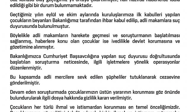 Yargı sürecinin titizlikle takip edileceği vurgulanan açıklamada, "Çocukların her türlü ihmal ve istismardan korunması en temel önceliğimizdir. Çocuklarımızın güvenliğini tehdit edecek hiçbir ihmal ve istismara müsamaha gösterilmeyecek ve bu konudaki mücadelemiz kararlılıkla sürdürülecektir. Evlatlarımızın huzurlu ve güvenli bir gelecekte büyümeleri için tüm imkanlarımızla yanlarında olmaya devam edecek, suçluların en ağır cezayı alması için Bakanlık olarak davaya müdahil olup, yargı sürecini titizlikle takip edeceğiz" denildi.