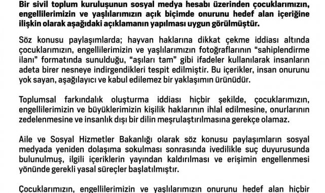 "Söz konusu paylaşımlarda; hayvan haklarına dikkat çekme iddiası altında çocuklarımızın, engellilerimizin ve yaşlılarımızın fotoğraflarının 'sahiplendirme ilanı' formatında sunulduğu, 'aşıları tam' gibi ifadeler kullanılarak insanların adeta birer nesneye indirgendikleri tespit edilmiştir. Bu içerikler, insan onurunu yok sayan, aşağılayıcı ve kabul edilemez bir yaklaşımın ürünüdür. Toplumsal farkındalık oluşturma iddiası hiçbir şekilde, çocuklarımızın, engellilerimizin ve büyüklerimizin kişilik haklarının ihlal edilmesine, onurlarının zedelenmesine ve insanlık dışı bir dilin meşrulaştırılmasına gerekçe olamaz. Aile ve Sosyal Hizmetler Bakanlığı olarak söz konusu paylaşımların sosyal medyada yeniden dolaşıma sokulması sonrasında ivedilikle suç duyurusunda bulunulmuş, ilgili içeriklerin yayından kaldırılması ve erişimin engellenmesi yönünde gerekli yasal süreçler başlatılmıştır. Çocuklarımızın, engellilerimizin ve yaşlılarımızın onurunu hedef alan hiçbir yaklaşım karşılıksız kalmayacaktır."