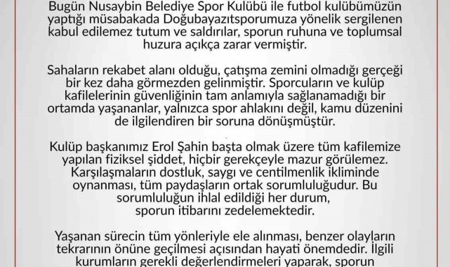 Geçit, açıklamasında, "Nusaybin Belediye Spor Kulübü ile futbol kulübümüz arasında oynanan müsabakada Doğubayazıtsporumuza yönelik sergilenen tutum ve saldırılar, sporun ruhuna ve toplumsal huzura zarar vermiştir. Sahaların rekabet alanı olduğu, çatışma zemini olmadığı gerçeği bir kez daha göz ardı edilmiştir." değerlendirmesinde bulundu.