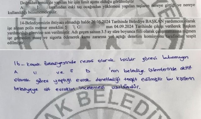Denetim raporunda dikkat çeken örneklerden biri olarak, belediyeye 20 Mayıs 2024'te başkan yardımcısı olarak alınan emekli bir polis memurunun yaklaşık 3,5 ay fiilen çalışmadan 4 Eylül 2024'te işten ayrıldığı halde maaş ve SGK primlerinin ödendiğini belirten Bakır, "Bu kişi ikinci kez emekli edilerek hem belediyemize hem de Hazine ve Maliye Bakanlığına zarar verilmiştir" ifadelerini kullandı.