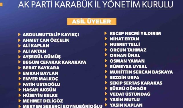 AK Parti Karabük İl Yönetim Kurulu asil üyeleri Ferhat Salt, Abdulmuttalip Kayıkçı, Ahmet Can Özçelik, Ali Kaplan, Ali Aktan, Ayşegül Gümüş, Begüm Cefakar Karakaya, Berat Baykara, Emrah Baylan, Enver Malkoç, Fatih Ustaoğlu, Hasan Akgün, Hüseyin Belke, Mehmet Deligöz, Meryem Şekerci Boynueğrioğlu, Muhammet Kaya, Murat Derecik, Murat Erkeçoğlu, Murat Dikilitaş, Mustafa Çorbacı, Mustafa Tekelioğlu, Recep Necmi Yıldırım, Nihat Ertan, Nusret Telli, Orçun Tahmaz, Orhan Ünal, Osman Yaman, Rümeysa Uysal, Muhittin Sercan Başkaya, Sezgin Urfa, Şekip Sertaş Karakaş, Şükrü Güngör, Vedat Üstündağ, Yasin Mutlu, Yasin Kaplan, Yıldıray Yıldırım, Yılmaz Kırık, Yusuf Duyku, Zehra Söylemez ve Zühal Kahraman isimlerinden oluştu.