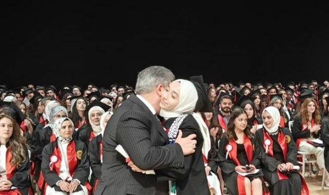 Daha sonra fakülteden mezun olan Ravzagül Özsoy, babası AK Parti Kayseri Milletvekili Özsoy'un elini öperek diplomasını aldı.