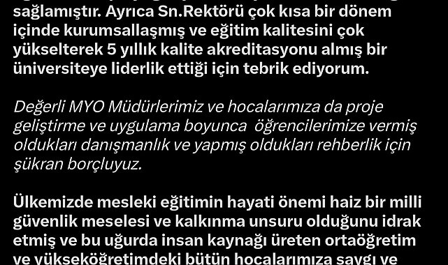 Cıngı yaptığı paylaşımda, "Rektörümüz Prof. Dr. Kurtuluş Karamustafa'ya güzel ifadelerinden dolayı teşekkür ediyorum. Kendisi ilk andan itibaren bu sürece heyecanla sahip çıkmış ve öğrencilerin proje geliştirmesi için her türlü desteği sağlamıştır. Ayrıca Rektörü çok kısa bir dönem içinde kurumsallaşmış ve eğitim kalitesini çok yükselterek 5 yıllık kalite akreditasyonu almış bir üniversiteye liderlik ettiği için tebrik ediyorum. Değerli MYO Müdürlerimiz ve hocalarımıza da proje geliştirme ve uygulama boyunca öğrencilerimize vermiş oldukları danışmanlık ve yapmış oldukları rehberlik için şükran borçluyuz. Ülkemizde mesleki eğitimin hayati önemi haiz bir milli güvenlik meselesi ve kalkınma unsuru olduğunu idrak etmiş ve bu uğurda insan kaynağı üreten ortaöğretim ve yükseköğretimdeki bütün hocalarımıza saygı ve sevgilerimizi sunuyoruz. Start-Up MYO yarışmasına katılan ve hem kendisi hem de ülkemiz için kafa yorarak proje üretme başarısını gösteren tüm öğrencilerimizi de tebrik ediyor başarılar diliyoruz" ifadelerine yer verdi.