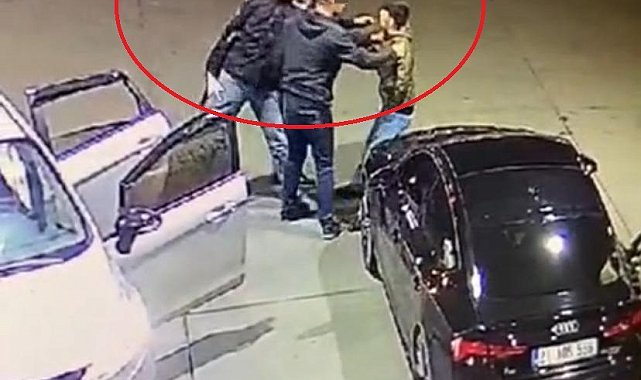 Akaryakıt istasyonunda silahlı grubun genci darbederek araca bindirdiği anlar kamerada