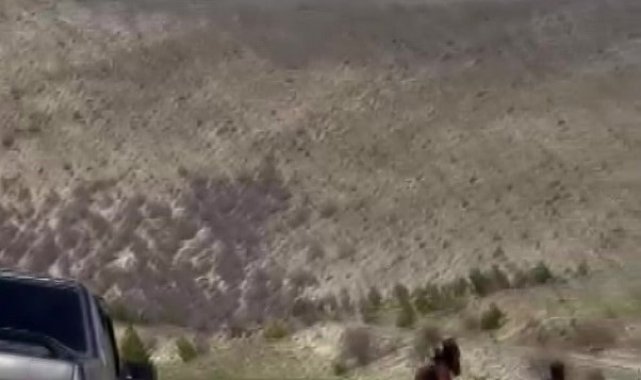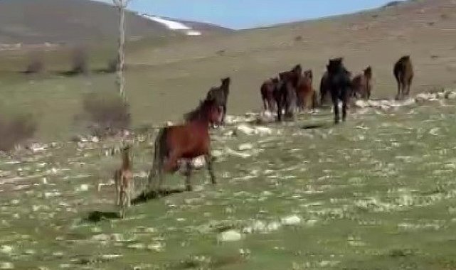 Amasya'da Akdağ'ın maskotu yılkı atları seyir halindeki araçların önüne çıktı. Amatör kameraya yansıyan sürüdeki taylar da ilk defa görüntülendi.