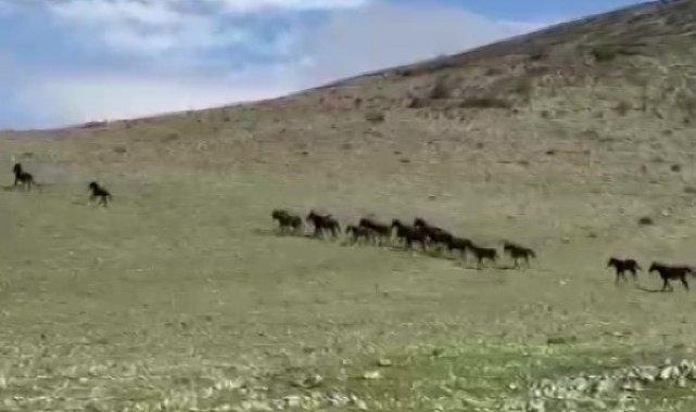 Yaklaşan otomobilleri fark edince yaşam alanlarına doğru hızla koşan yılkı atı sürüsünde 20'den fazla atın yanı sıra yeni doğan tayların da olduğu görüldü.