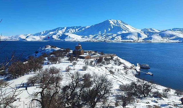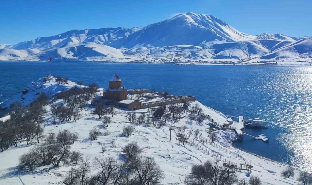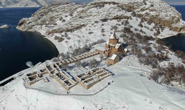 Van Gölü'nün incisi Akdamar Adası, etkili olan kar yağışıyla birlikte adeta beyaz gelinliğini giydi. Tarihi Akdamar Kilisesi ve ada çevresini saran kar örtüsü kartpostallık görüntüler oluştururken, manzarayı görmek isteyen doğaseverler soluğu adada aldı.