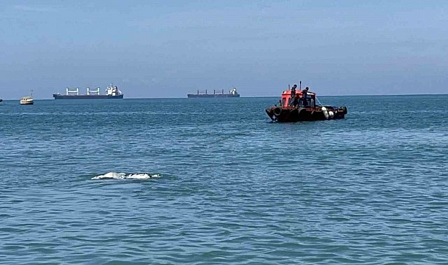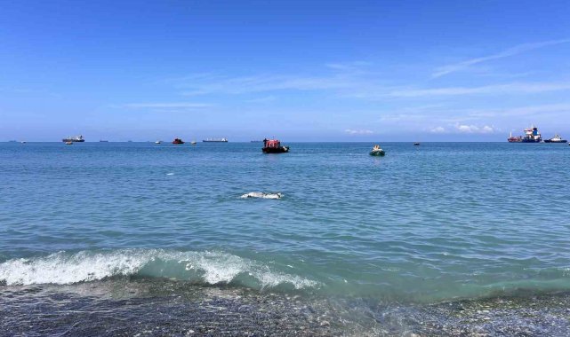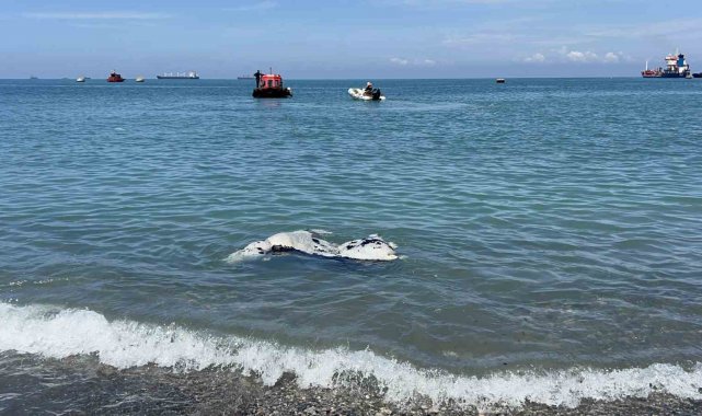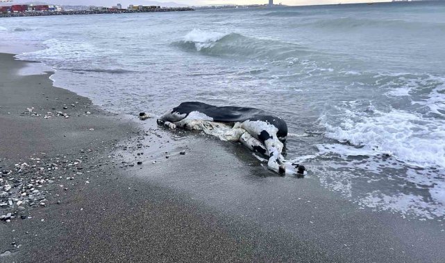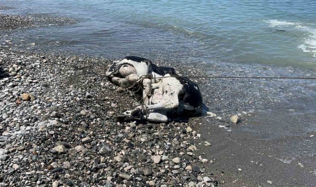 Hatay'da denize düşerek telef olan ve kıyıya vuran angus, ekipler tarafından kıyıdan kaldırıldı.