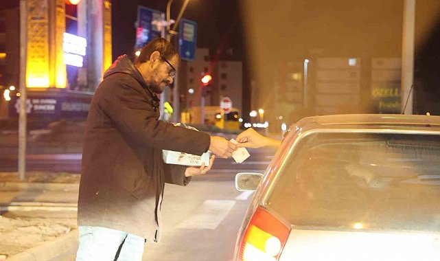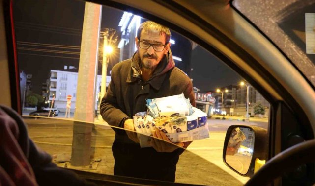 Aksaray'da elindeki mendil kutusuyla karayollarındaki ışıklı kavşaklara çıkarak satış yapan 42 yaşındaki adam, gece boyunca sürücü ve yolculara mendil satarak kazanç sağlamaya çalışıyor.