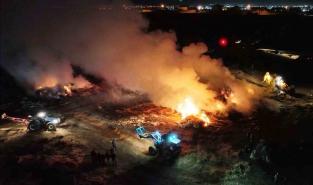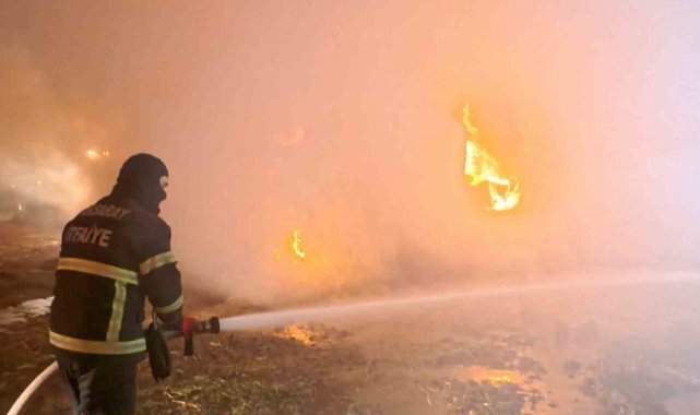 Aksaray'da üreticiye ait tarlada bulunan mandırada tonlarca saman çıkan yangında alev alev yandı. Gecenin karanlığını aydınlatan alevlerden çıkan dumanlar gökyüzünü sararken, yangını söndürme çalışması sürüyor.